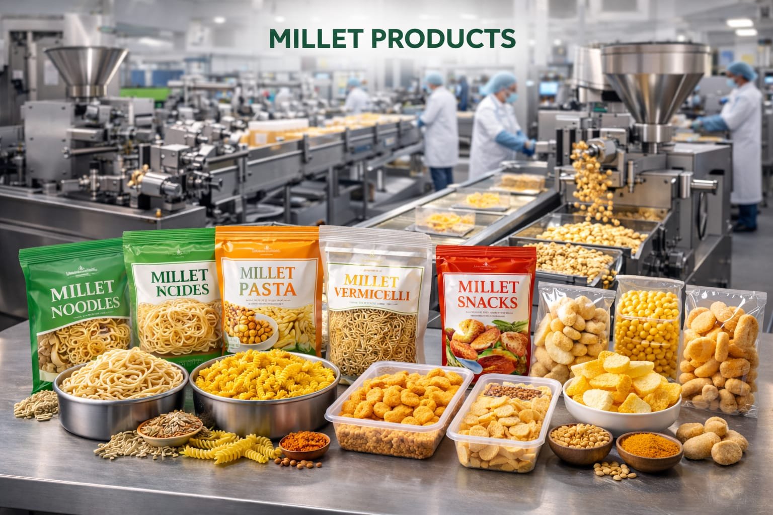 Millet noodles, pasta, vermicelli, snacks, chips Support: Millet processors & extrusion units, manufacturing coordination, first-order execution