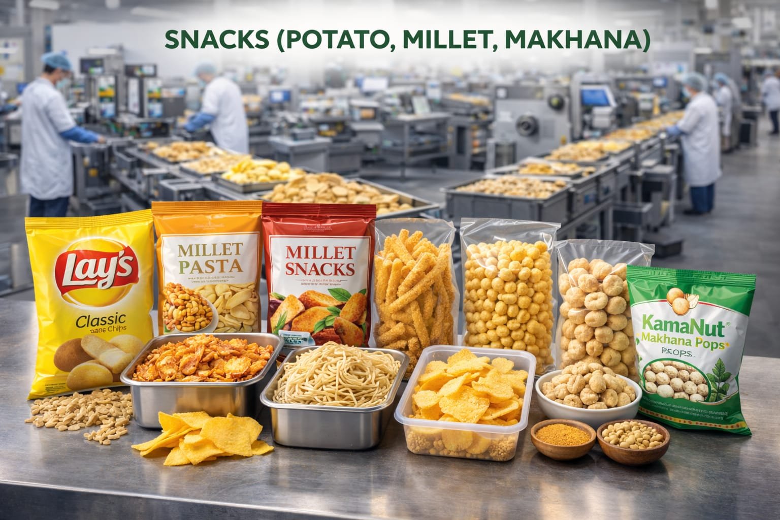 Potato, millet & makhana snacks, extruded products Support: Manufacturer identification, production & packaging coordination, batch planning